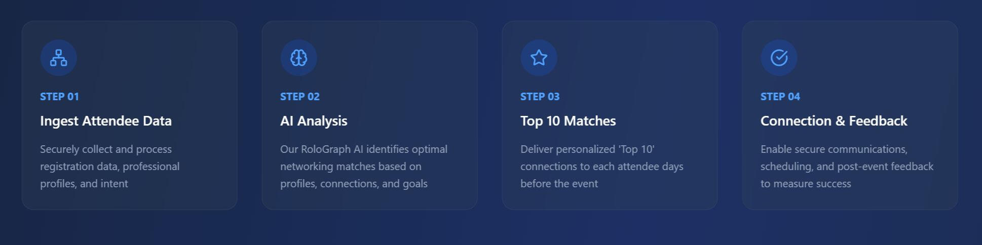 Our multi-layered AI architecture, powered by RoloGraph, RoloLogic, and RoloEngagement AI, processes professional profiles, intentions, and networking patterns to create meaningful connections. Built on a cloud-native infrastructure with enterprise-grade security and privacy controls, our technology ensures scalable, high-performance, and compliant operations. We are protected by multiple patents, underscoring our unique technical differentiation.
