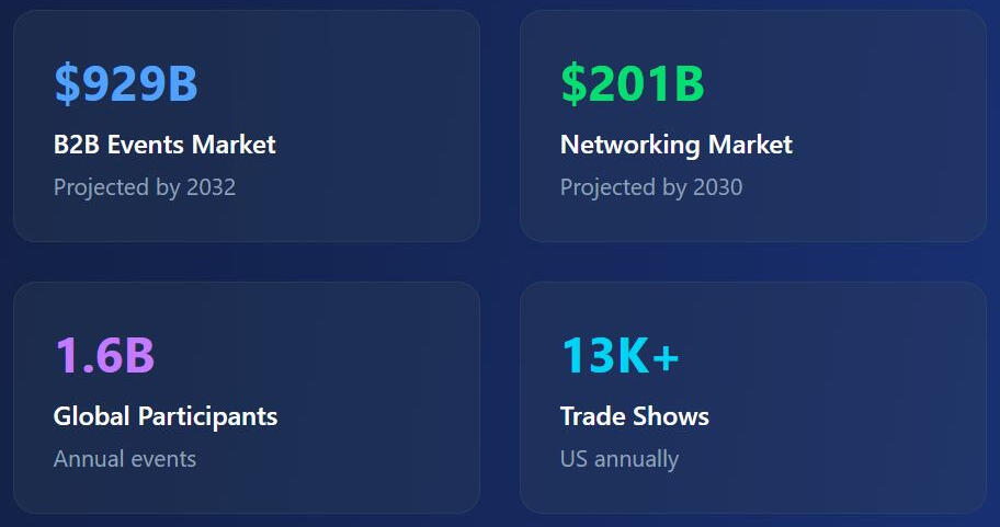 The global B2B events market is projected to grow from $498 billion to $929 billion by 2032, with professional networking alone expanding from $65 billion to $201 billion by 2030. Rolodots is uniquely positioned to capture a significant share of this rapidly expanding market, transforming how 1.6 billion global participants connect annually.